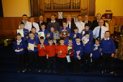 Donald Walker captain of Fort William Shinty team receives the Torlundy shield